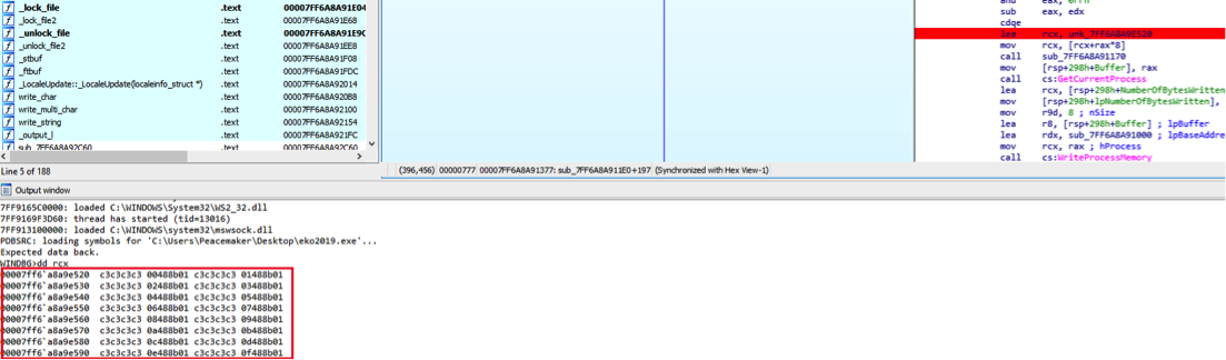 This value will be used in WriteProcessMemory as lpBuffer, basically copying these bytes to the function sub_7FF6A8A91000 as instructions allowing to control what we can execute when we reach it.